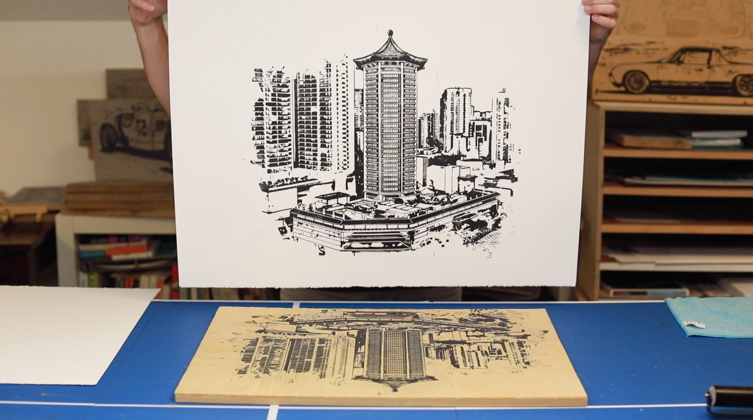 At the moment all the blocks are linoleum. This medium allows for solid, rich dark areas. Wood leaves a grain that reduces the depth of the image. However, that doesn't mean that some series won't be made in wood block in the future.